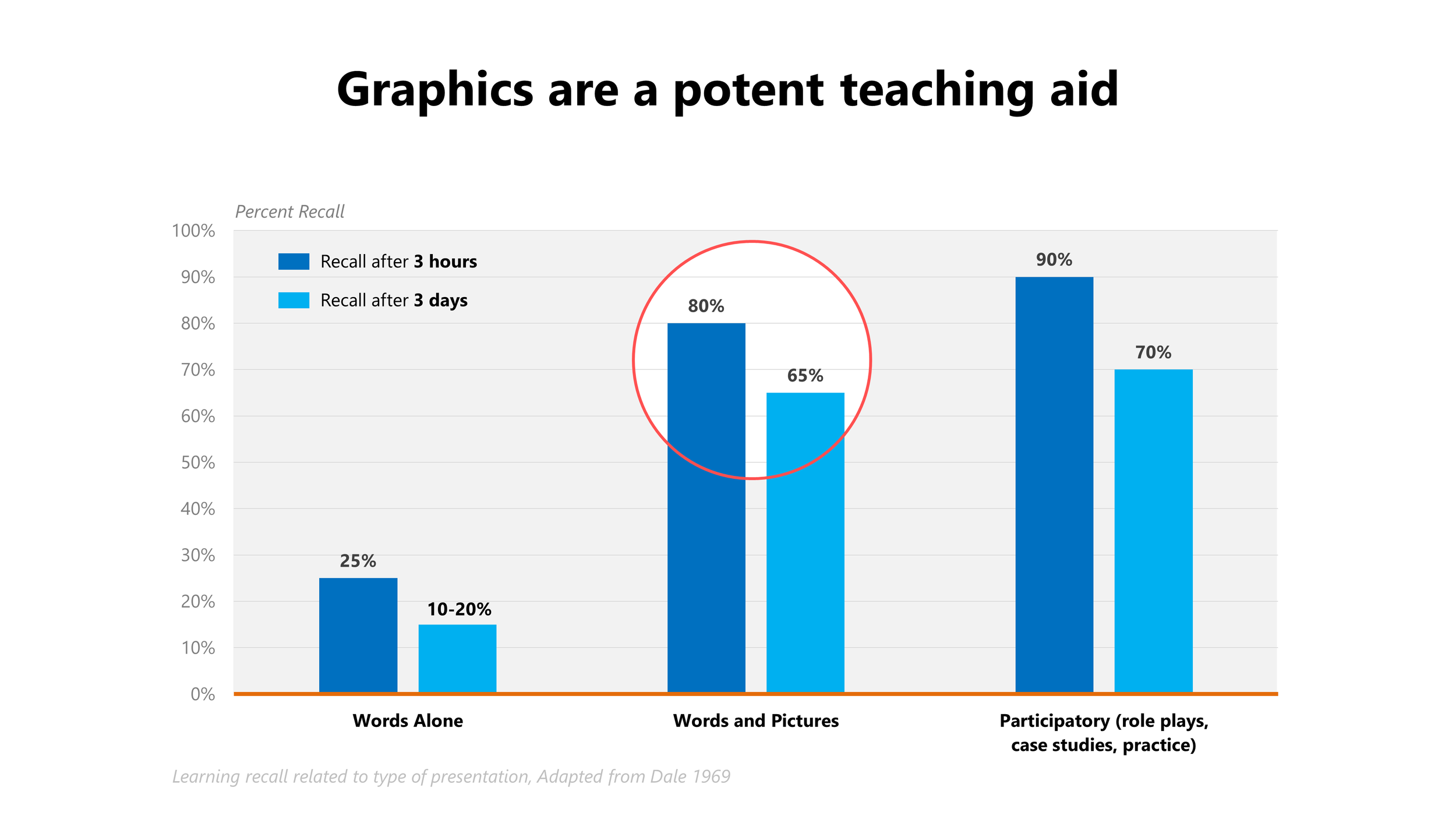 The power of pictures is not a little thing — it is a several hundred percent improvement in recall, short and long term, as shown by research published in the late 1960s by Dale, et al. Many studies, including by Houts, et al. in 2006, show a similar-scale improvement in comprehension using pictures as compared with words alone.