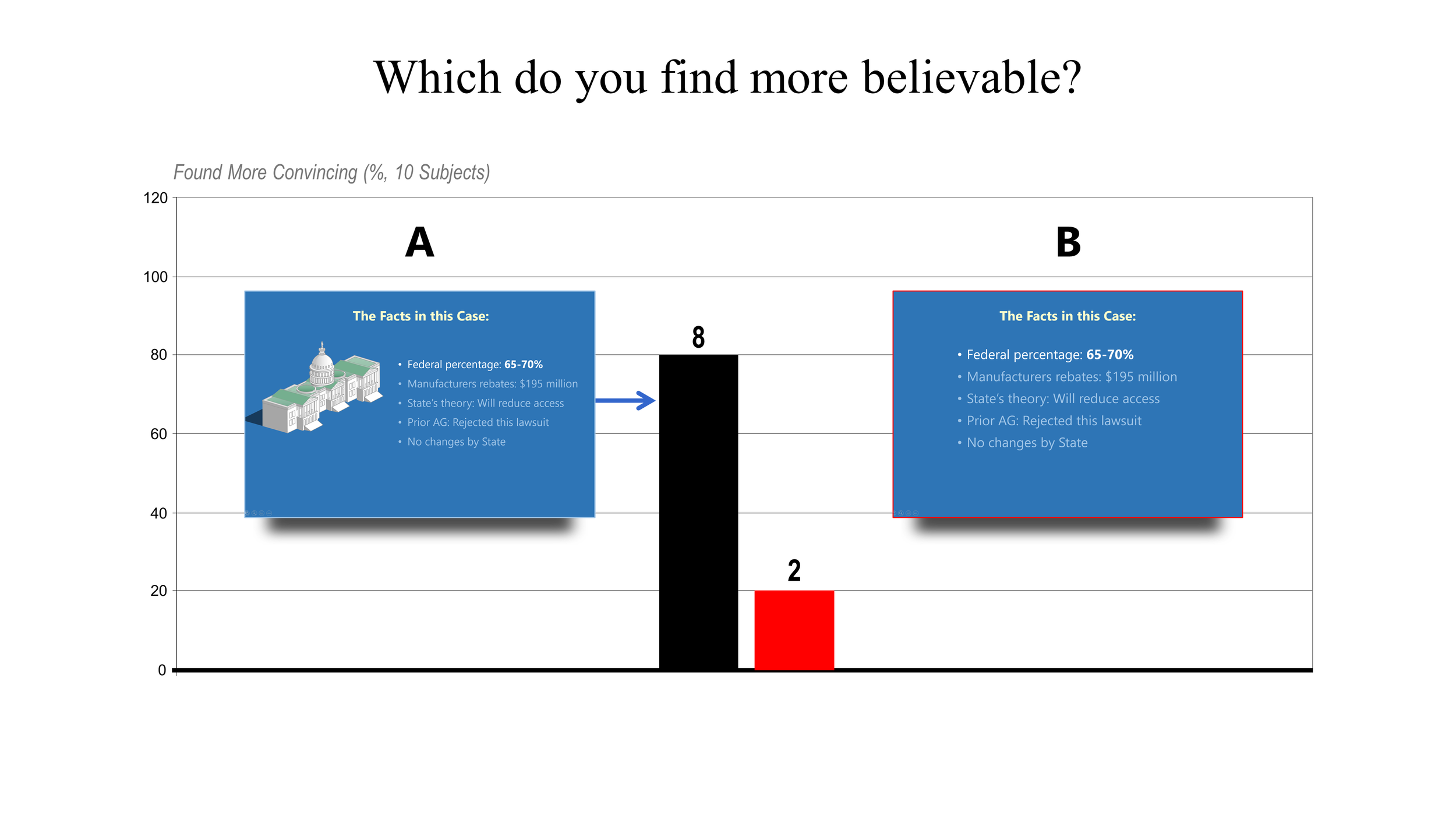 Graphics may have another effect that is of even more profound benefit to trial lawyers: in a small group study we did as an adjunct to a case focus group, we saw a multifold increase in the reported believability of images that include pictorial content over those with verbal content alone.