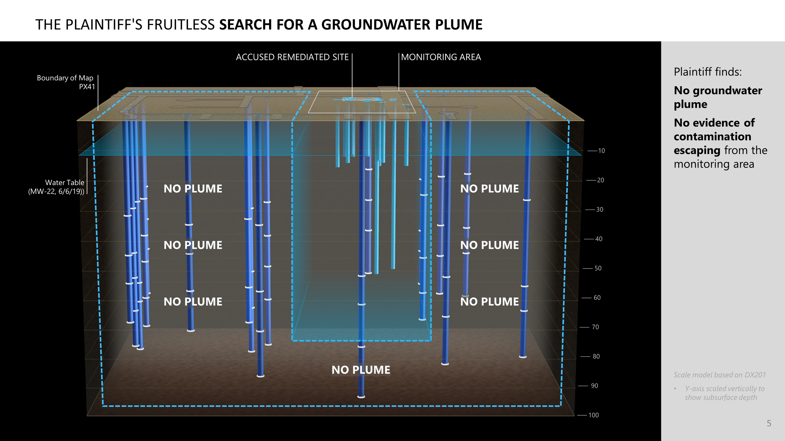 With this 3D animation, jurors receive an orientation to the basic hydrogeology of an accused site. At the same time, they build the visual and verbal vocabulary they need to understand and agree with the defense case.