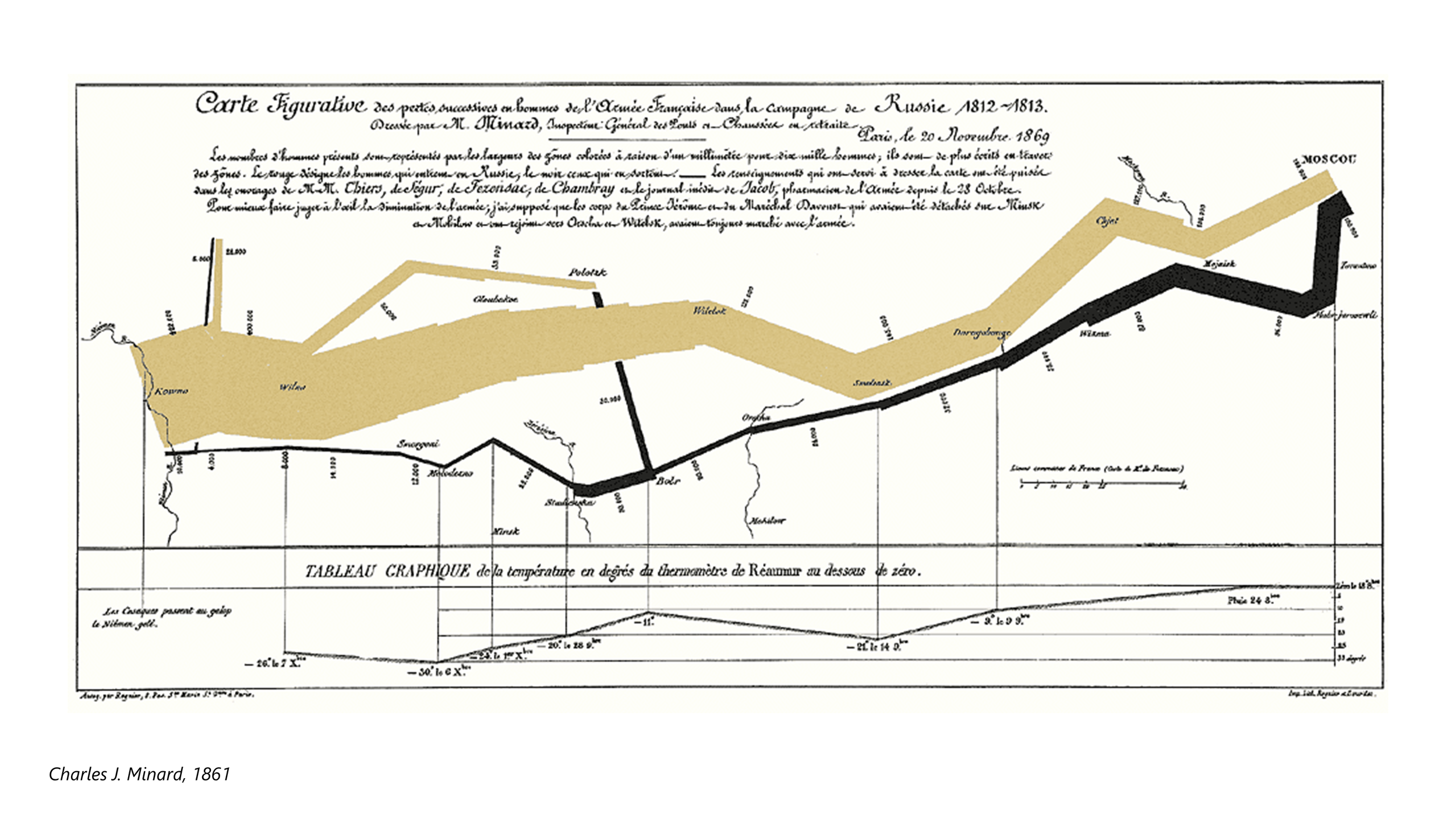 Minard’s 1861 diagram of Napoleon’s Russia campaign has been hailed by Edward Tufte as “the best statistical graphic ever drawn.” It offers a bold, instantly recognizable message (the decimation of Napoleon’s army) along with an engrossing set of detailed information, including time, location, direction and temperature—a great example of visual and data richness