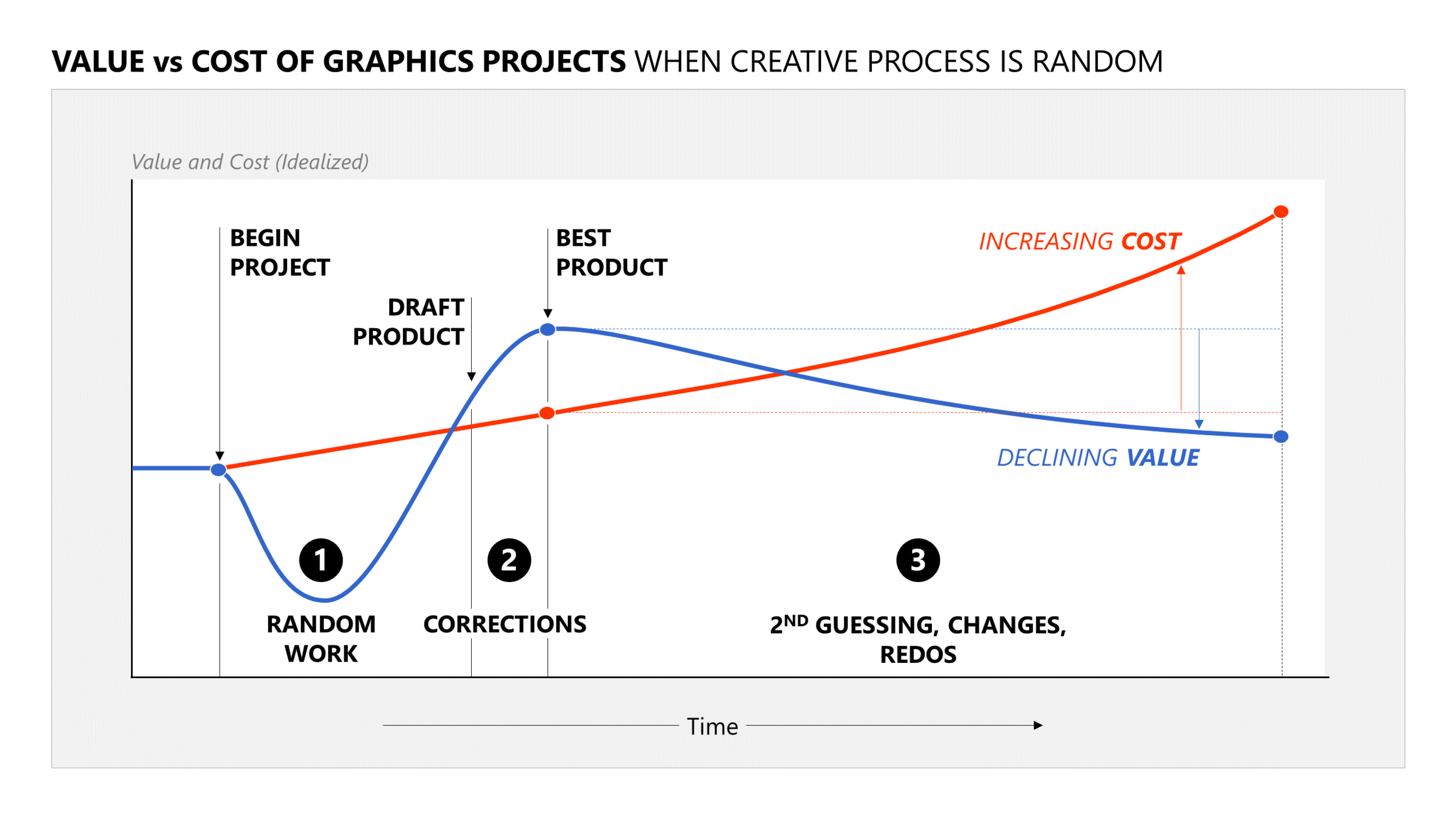 An idealized curve representing the productivity of a random creative process is shown, mapped against cost. We start with a trough of non-linear idea-seeking, followed by production of draft graphics. This is positive movement, and with corrections, the team reaches what tends to be the best product. This is too often followed by a period of second guessing, over-editing and re-doing. That 3rd period can be a huge cost driver, especially in a trial environment, and it can produce an actual decline in the quality and value of the product.