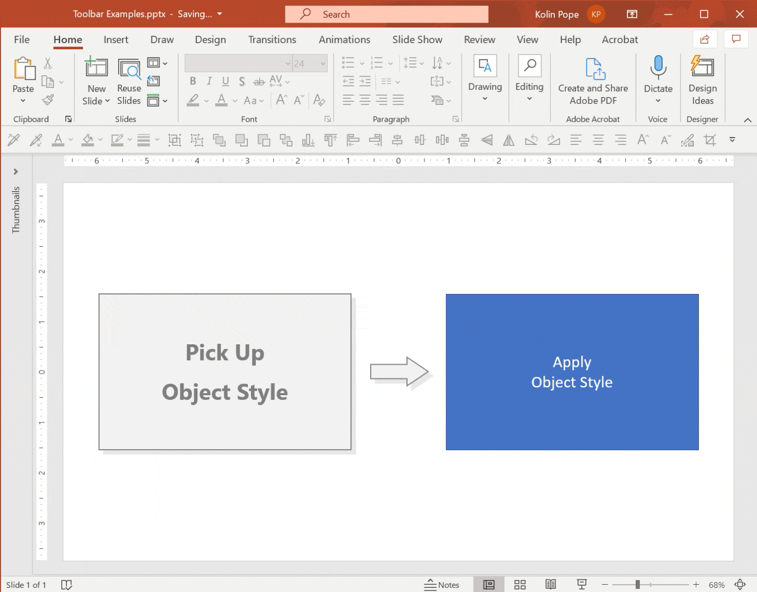 In the example above, an object style is Picked Up from the source object, the destination object is selected, and then Apply Style is used to copy all the styling properties onto the destination object.